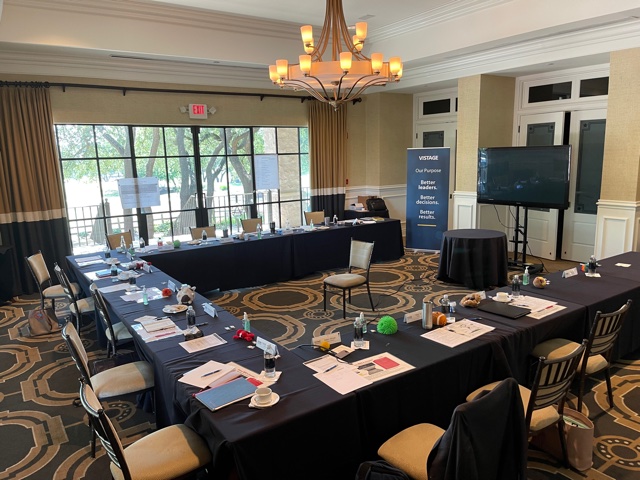 My Vistage business owner group is back in person after 15 months. Placemats, agenda, big screen, Vistage banners, easel pad and stand and hand sanitizer for everyone creates a full, caring, trusting and challenging all day executive session.